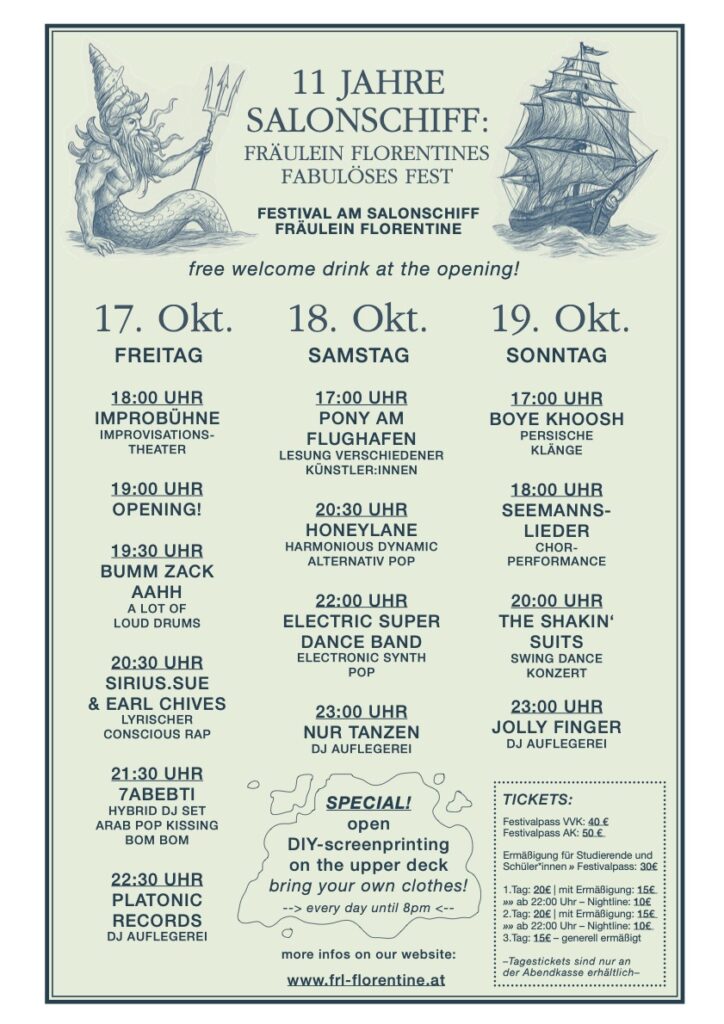Vom 17. bis 19. Oktober 2025 verwandelt sich das Salonschiff Fräulein Florentine in Linz in eine schwimmende Bühne für ein ganzes Wochenende voller Kultur und Feierlaune. Zum 11-jährigen Jubiläum erwarten euch Lesungen, Live-Konzerte, mitreißende DJ-Sets und Improtheater – alles in einzigartiger Atmosphäre direkt auf der Donau.